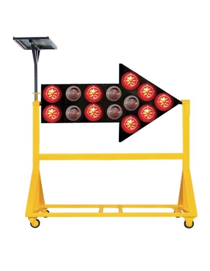 Equipo móvil con flechas LED de alta visibilidad, ideal para indicar desvíos en obras viales o cierres temporales. Funciona con batería recargable o energía solar, y puede montarse en tráiler o soporte portátil.